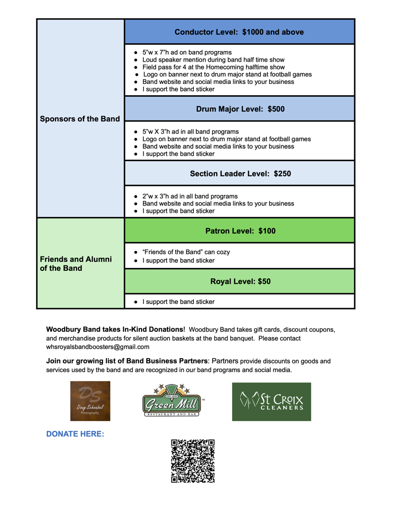 Donations can be made to the band boosters at anytime. Every dollar donated is greatly appreciated and helps support the mission and goals of the WHS band program. Woodbury Royals Band Boosters Inc is a 501(c)(3) registered nonprofit organization. Your donation may be deductible as a charitable deduction for income tax purposes.